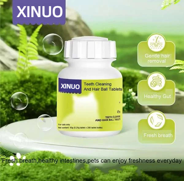 Teeth Cleaning And Hair Ball Tablets is a kind of pet supplements only used for cats.This product contains protease combined with natural dietary fiber, which can gently decompose the cat’s intestinal hair, reduce cat hair vomiting, promote cat’s gastrointestinal motility, and gently remove hair; it also contains a variety of vitamins and trace elements with scientific proportions to nourish hair, improve the production of hair balls from the source, and at the same time promote the balance of intestinal flora and maintain intestinal health.