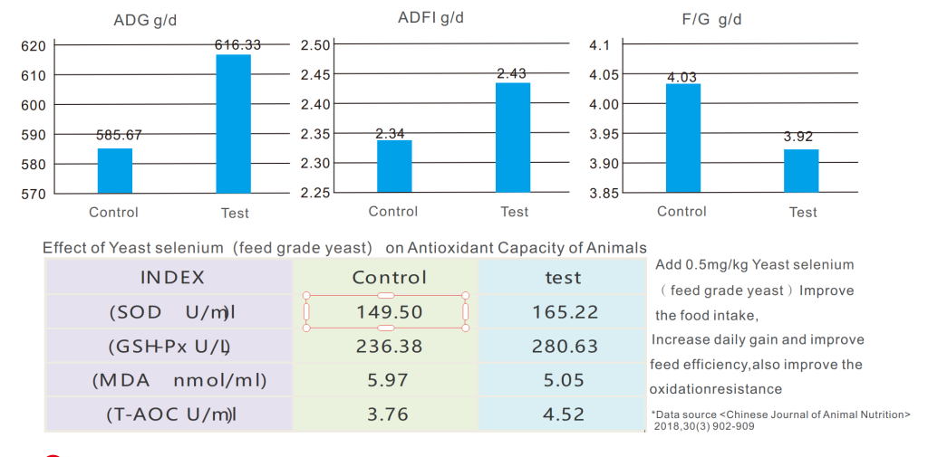 Choose 4 Yantai pigs weighs 70±1.3kg, control group is high nutrient dairy feed, cp:14.73%,DE: 13.11MJ/kg, test group supply 0.5mg/kg Yeast selenium(feed grade yeast) to the daily feed 105 days, Determination of production performance, antioxidant index is below: