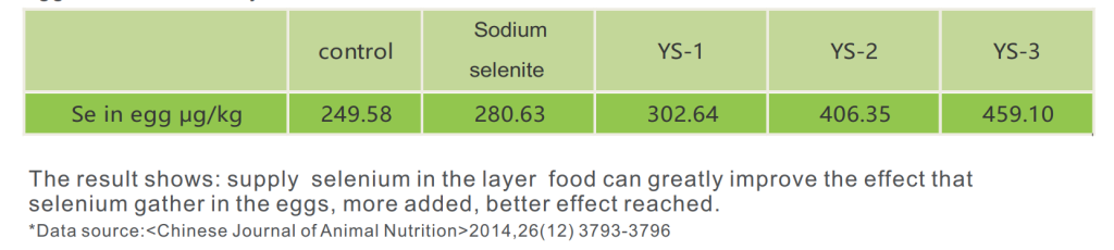 Choose 360 Healthy Helan layer hens that are 30weeks, divided into 5 groups, feed dairy food in control group, no extra add of Yeast selenium(feed grade yeast); the test group supply sodium selenite sourced selenium 0.30mg/kg, Yeast selenium(feed grade yeast) 0.10mg/kg, 0.20 mg/kg, 0.30mg/kg , test the selenium in Eggs after feed 20days.